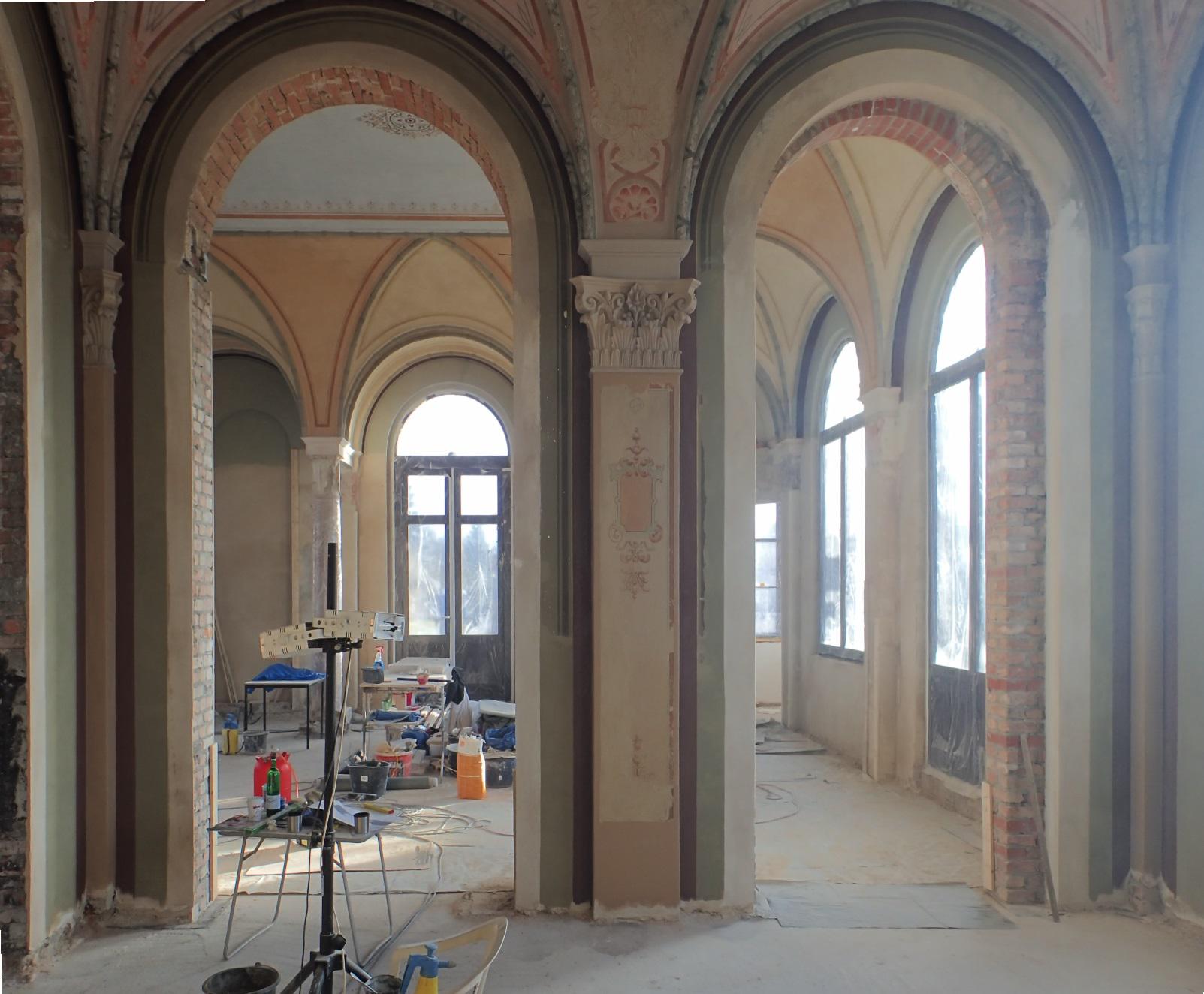 2016 Kaiserbahnhof in Halbe, Restaurierung der Decken- und Wandmalerei in den drei Haupträumen.